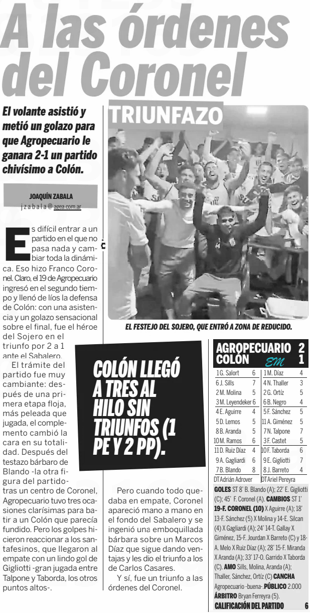 | AGROPECUARIO 2 53' Blando 90' Coronel | COLON 1 67' Gigliotti |